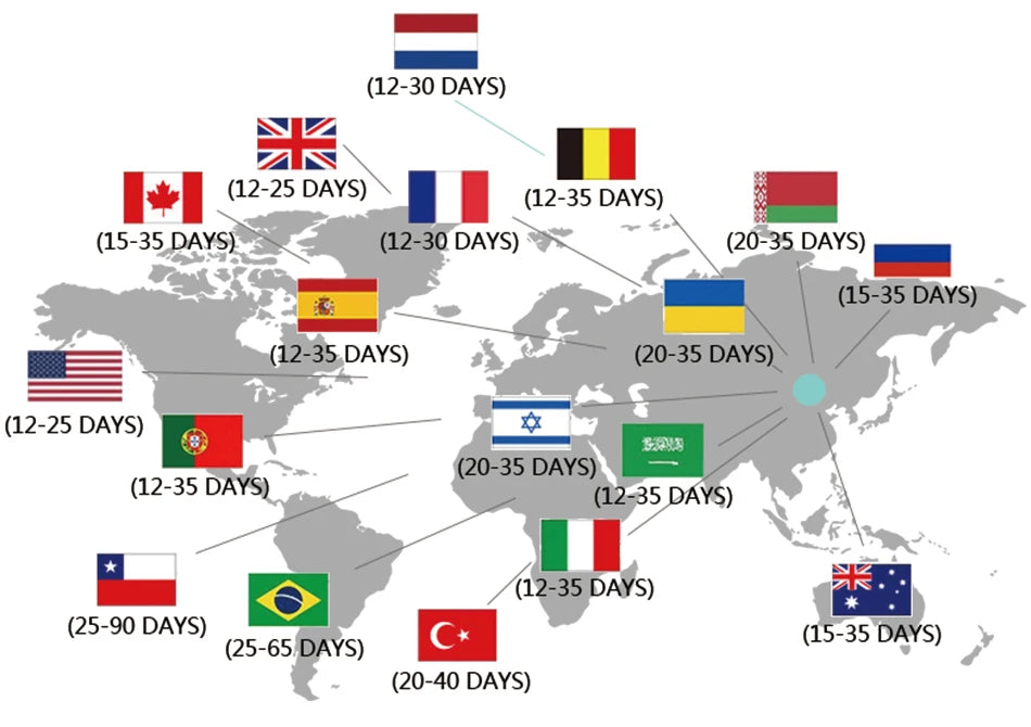 West Euro, Mid-East, Oceania and East Euro Usually Takes 10-30 Working Days